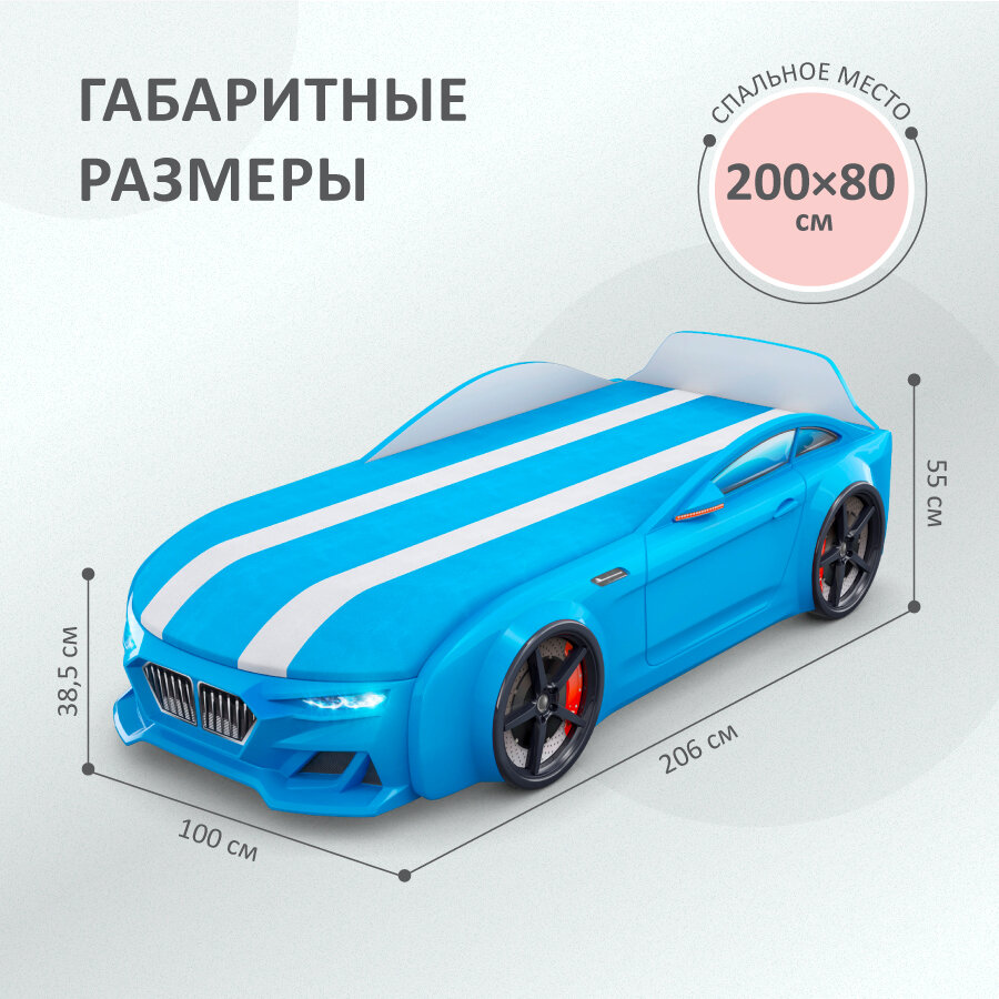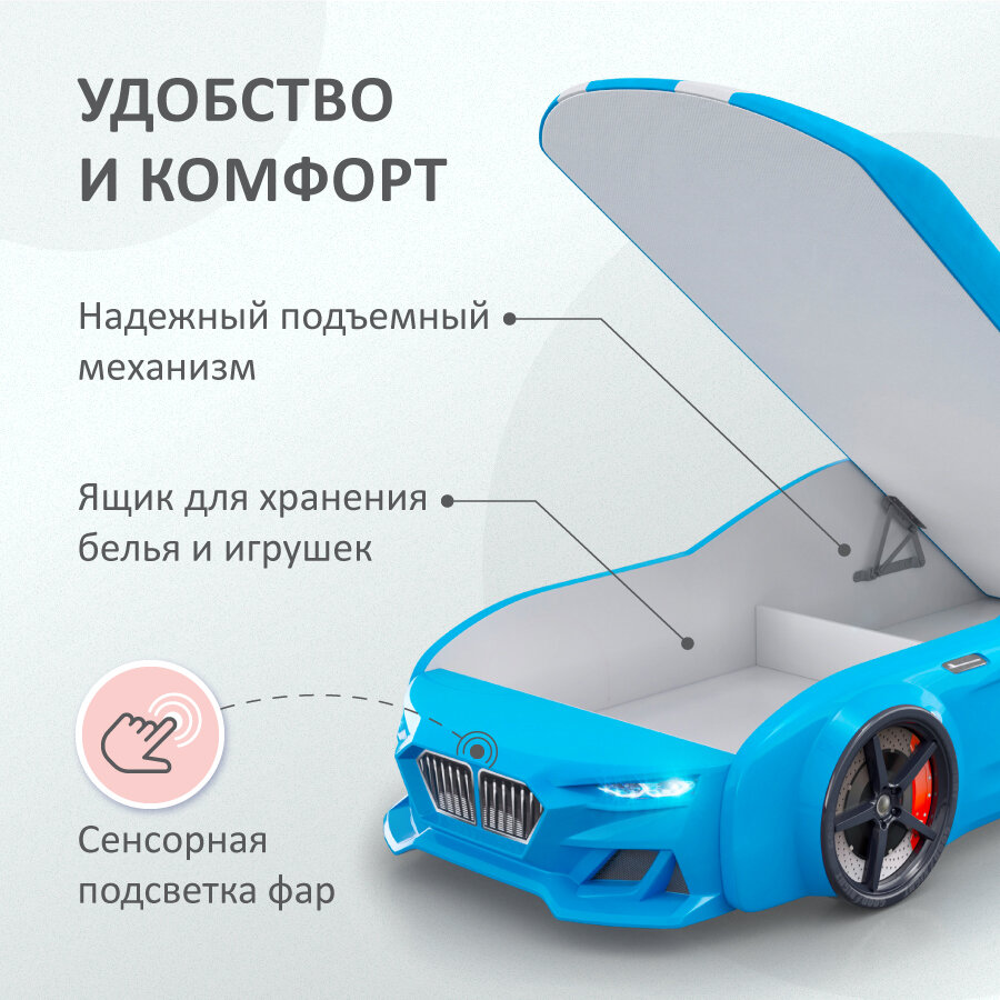 10 цен на Кровать детская Romack Dynamic-M голубая 80*200 с подсветкой фар, подъемным механизмом, ящиком для белья, матрас 80*200 см