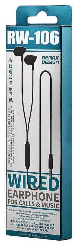 Гарнитура REMAX RW-106 Earphone 3.5 мм, 1.2м, вставная (черный) информация: