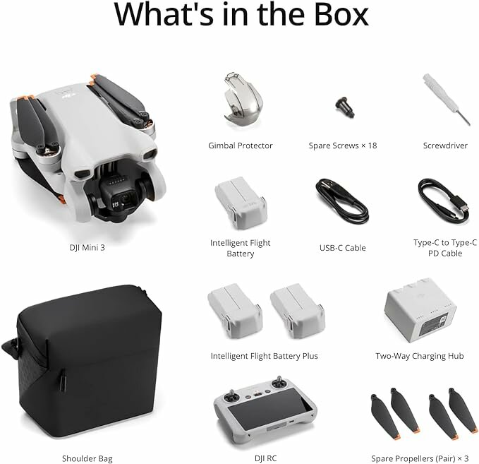 | Комплектация | аккумулятор для полета, запасные пропеллеры (пара), запасные винты - 6 шт., отвертка, защита карданного подвеса, кабель PD от Type-C до Type-C |