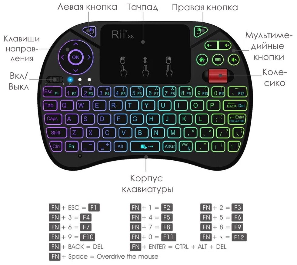 Беспроводная клавиатура c подсветкой, тачпадом и колесиком Rii X8 PRO информация: