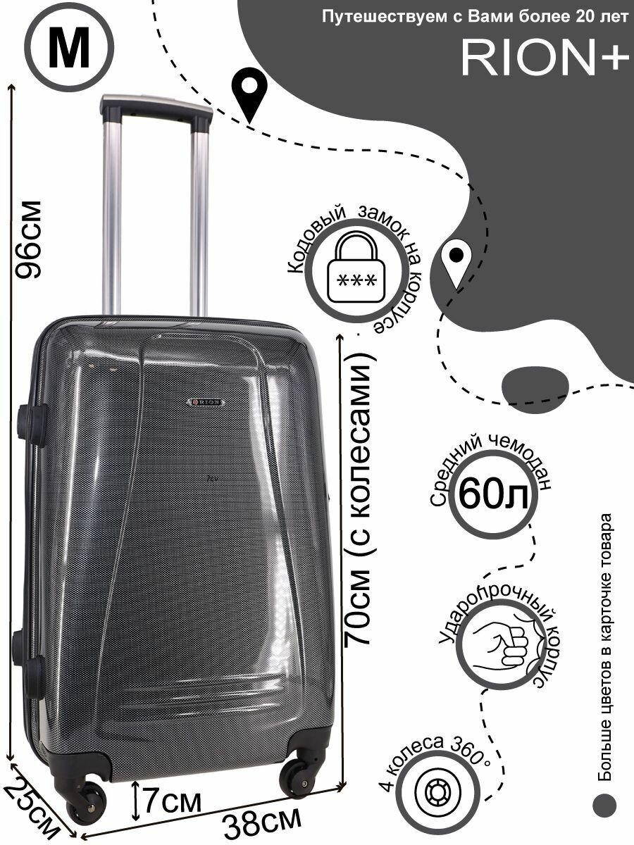 Чемодан Рион+ (RION+) R416, Пластик, 65 см, 60 литров, 4 колеса, M (56-70 см), усиленный толстый пластик, темно-серый