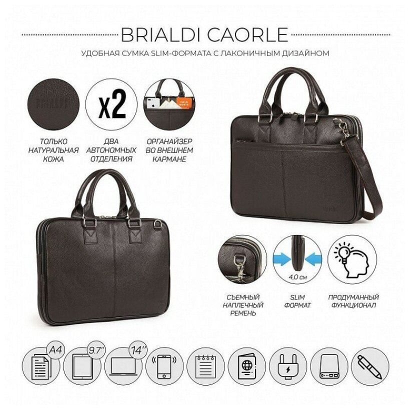 Сумка мужская деловая Brialdi Caorle relief brown (коричневая) для формата A4 или ноутбука 14 дюймов из натуральной кожи информация: