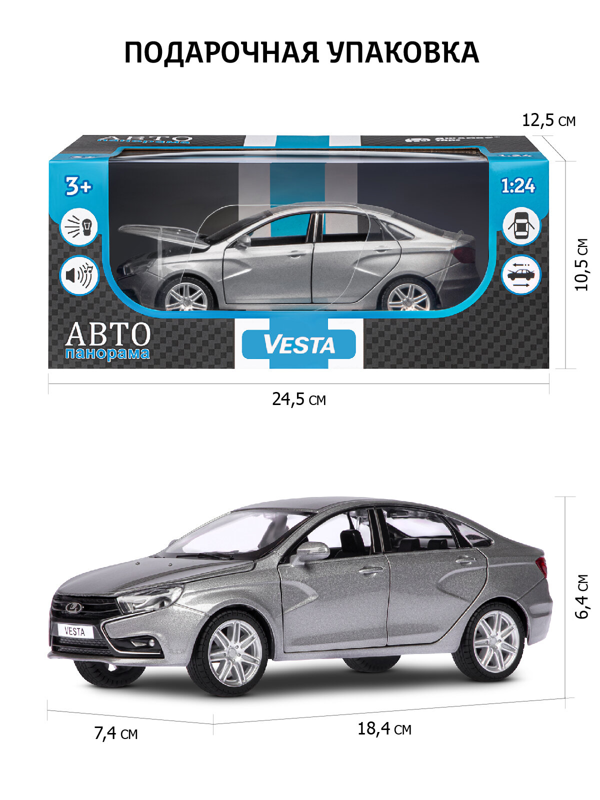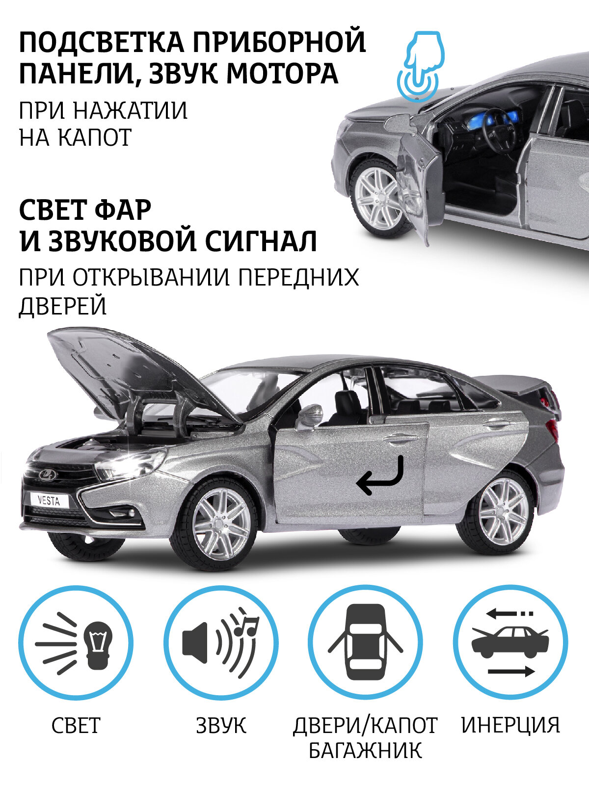 Модель Lada Vesta седан серый Автопанорама масштаб 1:24, свет, звук, откр все двери, капот, багажник