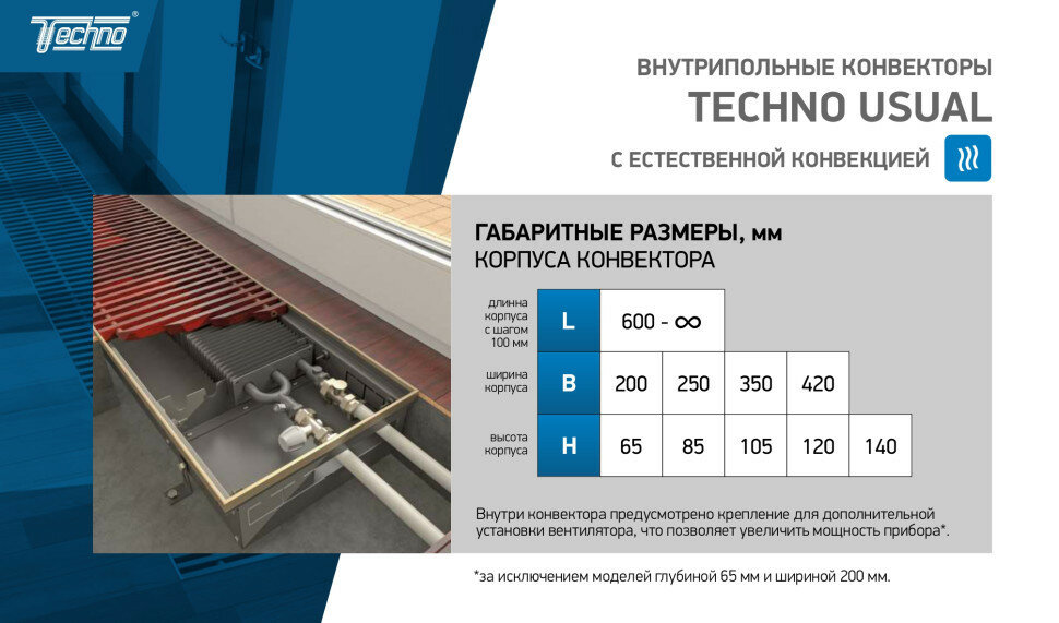 Внутрипольный конвектор водяной Techno Usual KVZ 250-65-800 с естественной конвекцией информация: