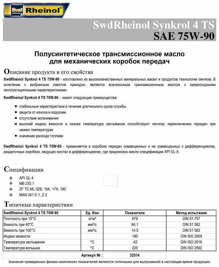 Масло Транс Synkrol 4 Ts 75w90 П/С (1л) SWD Rheinol арт. 32514,180 информация: