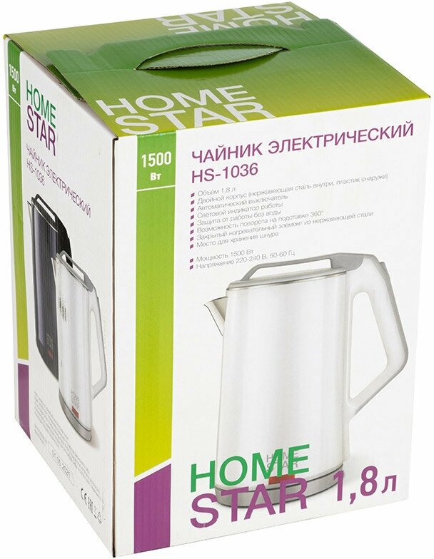 Отзывы на Чайник электрический HS-1036, пластик, колба металл, 1.8 л, 1500 Вт, белый