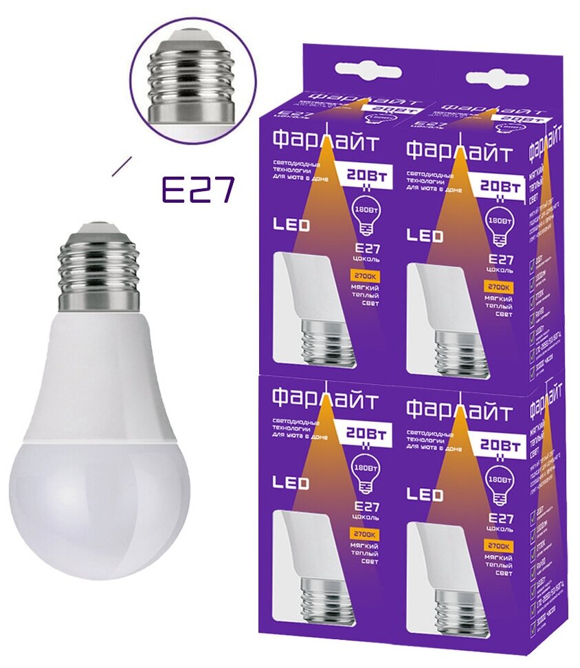 Лампочка светодиодная груша А70 / 20 Вт / 2700 К / Е27 / Фарлайт / Комплект 4 шт информация: