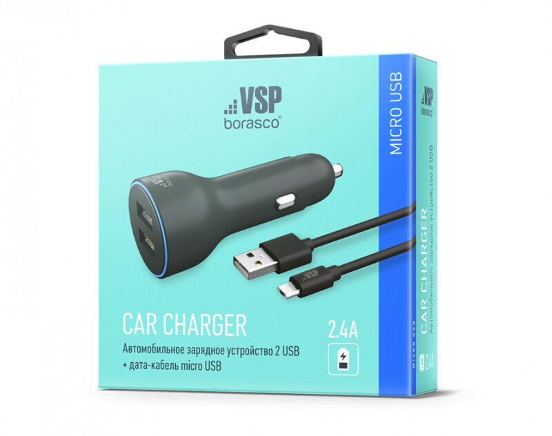 Автомобильное зарядное устройство BORASCO 2USB, 2,4A + дата-кабель micro USB, 2А, 1м черное информация: