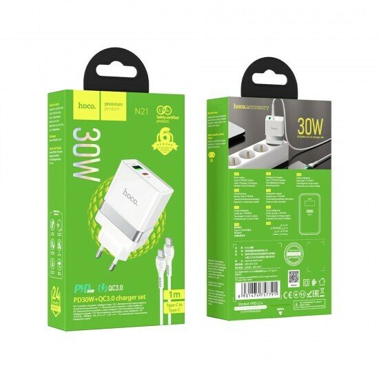 Сетевое зарядное устройство 2 в 1 Hoco N21 PD30W+QC3.0, кабель Type C-Type C, 012765 Белый информация: