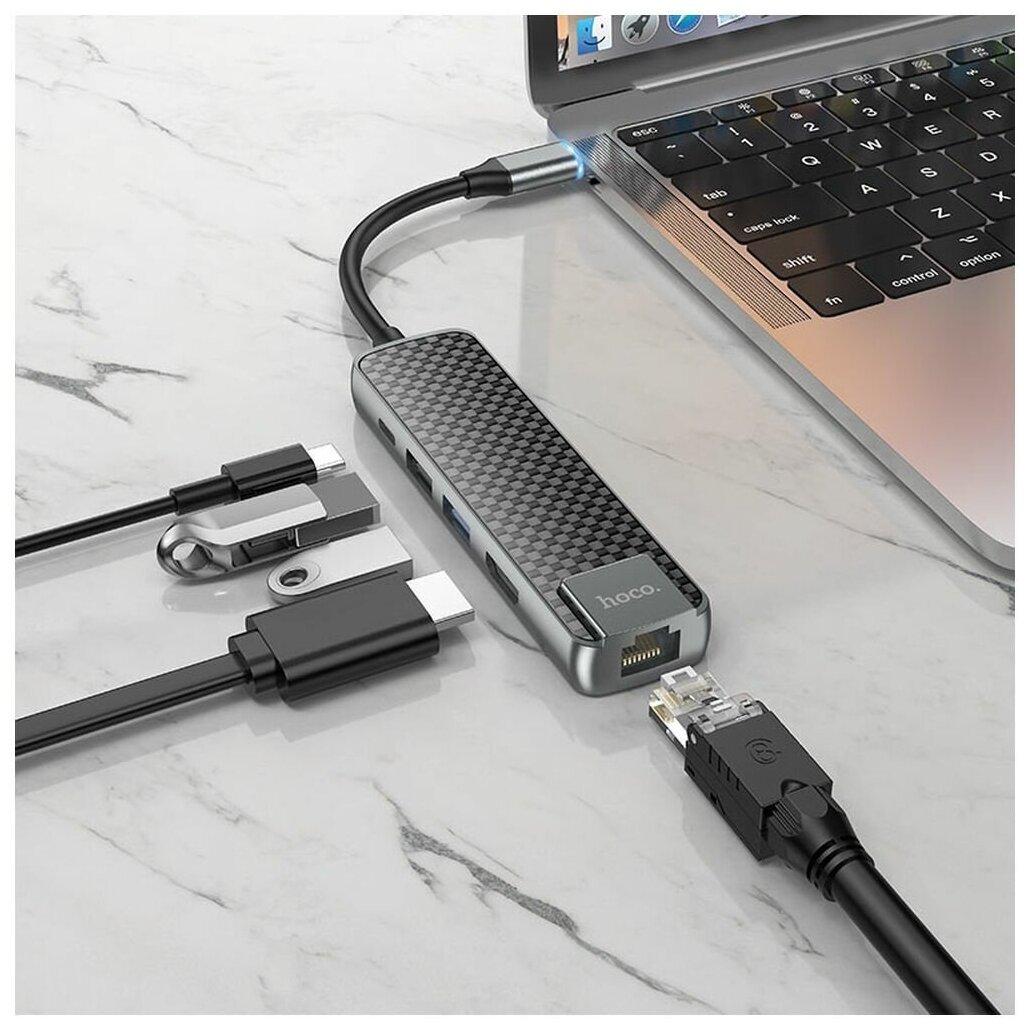 Многофункциональный Type-C хаб Hoco HB23 Easy view HDMI + USB3.0 + USB2.0 + RJ45 + PD, черный с серым