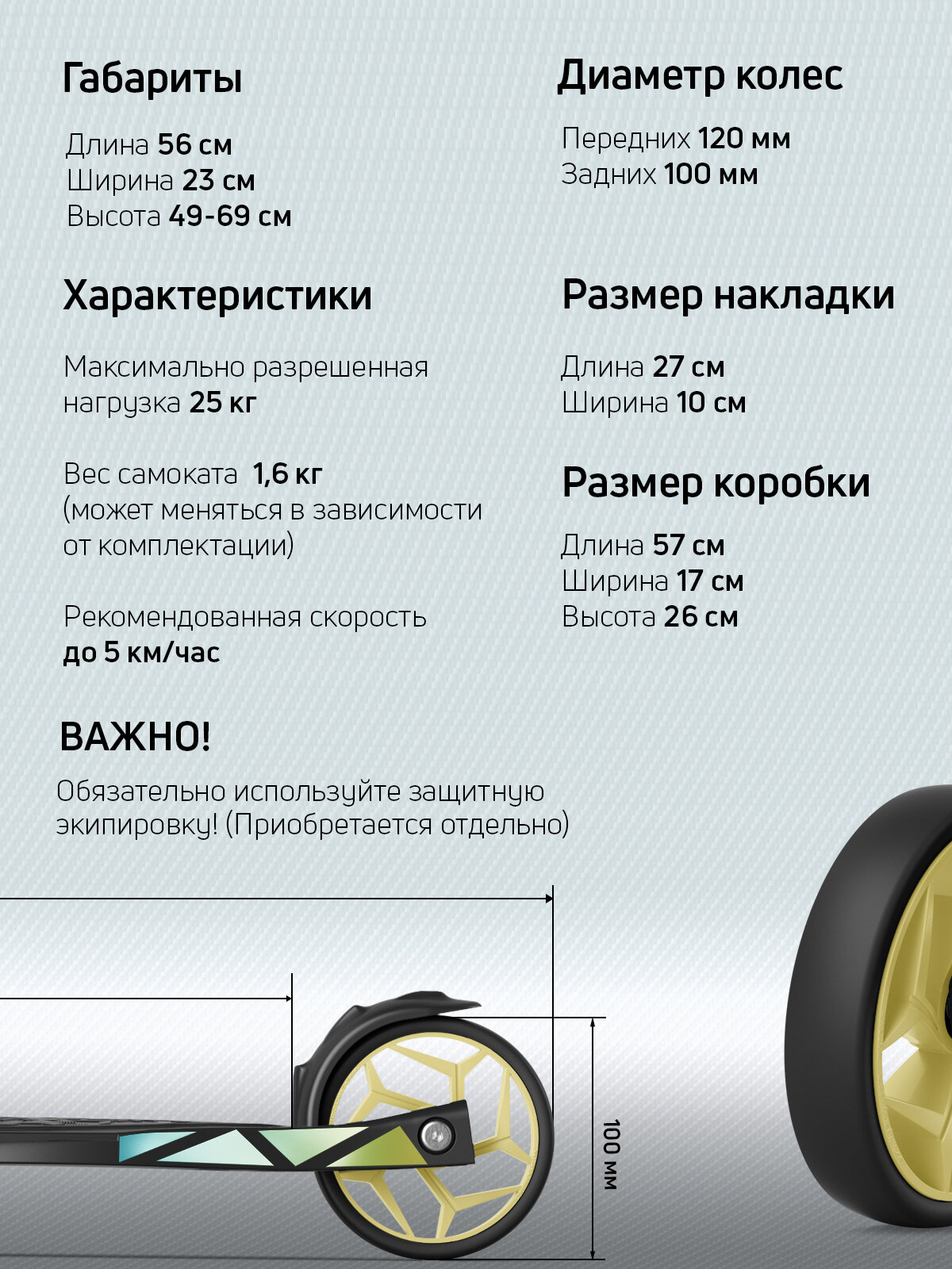 | Дополнительная информация | диаметр заднего колеса: 100 мм; ширина деки: 10 см; класс подшипника: ABEC 7; минимальная высота рулевой стойки: 49 см; вид тормоза: наступной; материал колес: полиуретан; длина деки: 27 см |