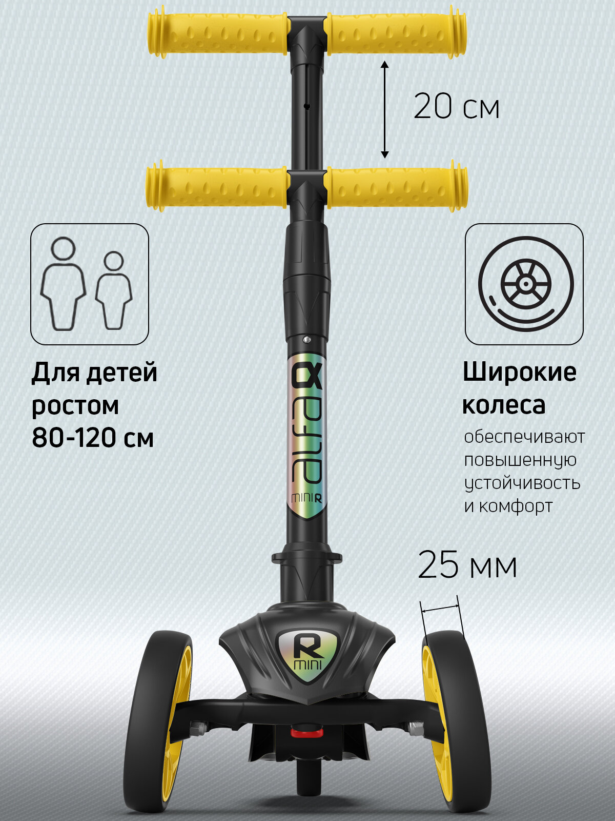 Самокат, самокат трехколесный детский, с цветными колесами и цветными ручками, Buggy Boom Alfa Mini R, желтый информация: