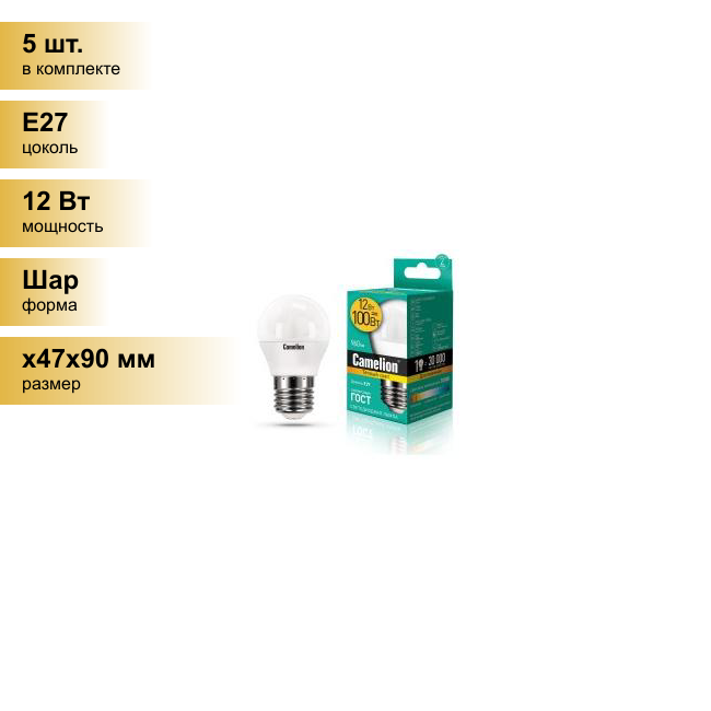 10 цен на Лампа светодиодная шар 12Вт, G45, E27, 3000K, 220В Camelion - 5 штук!