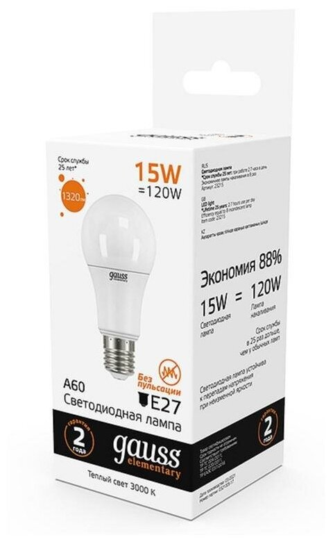 Отзывы на Лампа светодиод А60 15Вт 1320Лм 3000К E27 Gauss Elementary (1/10/50)