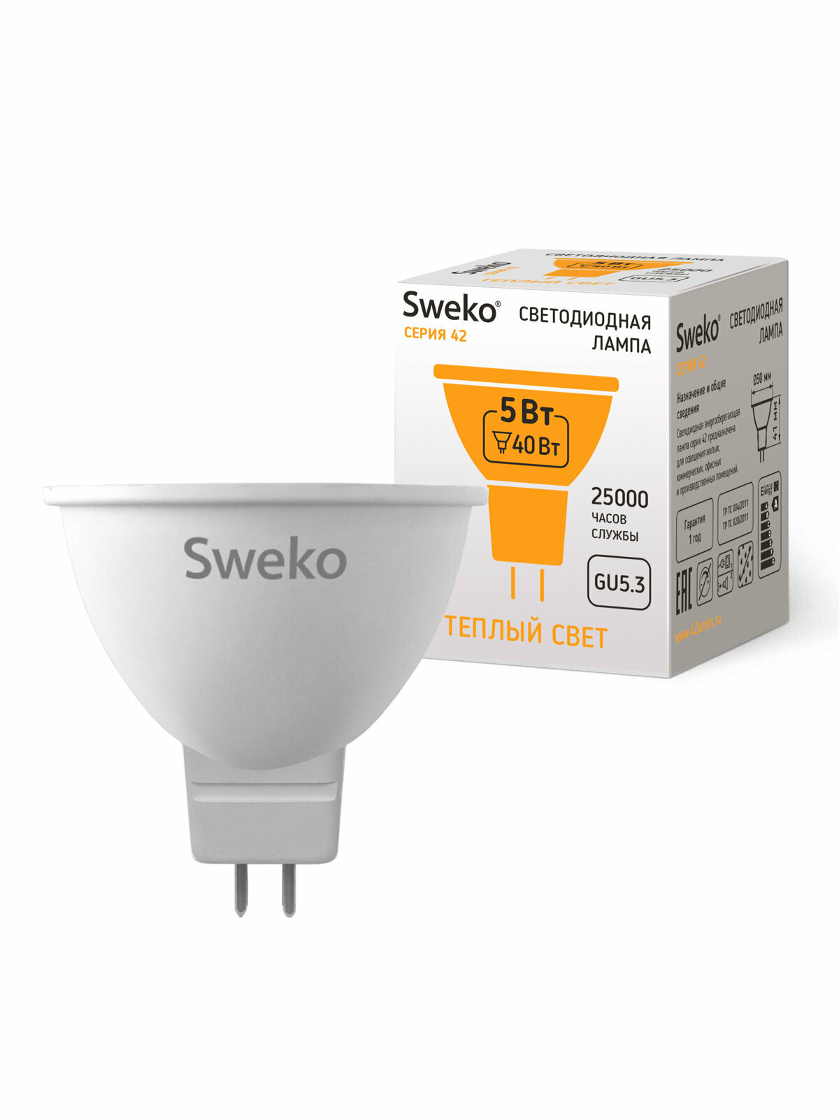 Комплект из 5 штук. Sweko Светодиодная лампа Серия 42 MR16 матов GU5.3 5W(420m) 3000K 41х50 информация: