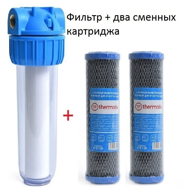 10 цен на Комплект Магистральный фильтр "Thermofix" (1/2" колба с гайкой, 10", с картриджем) (+ 2 картриджа прессованный уголь, черный, 5 мкн) Slim Line
