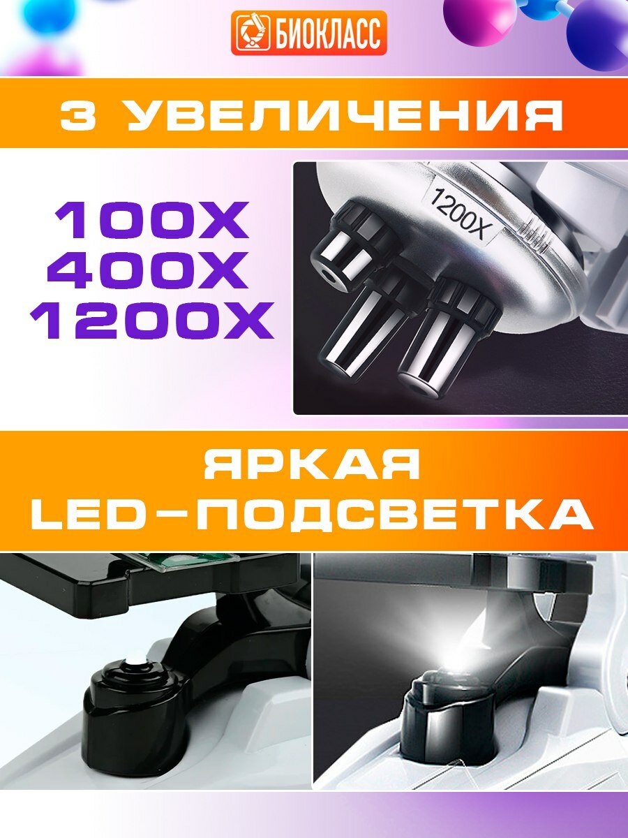 Микроскоп "Юный исследователь", кратность увеличения 1200х, 400х, 100х, с подсветкой