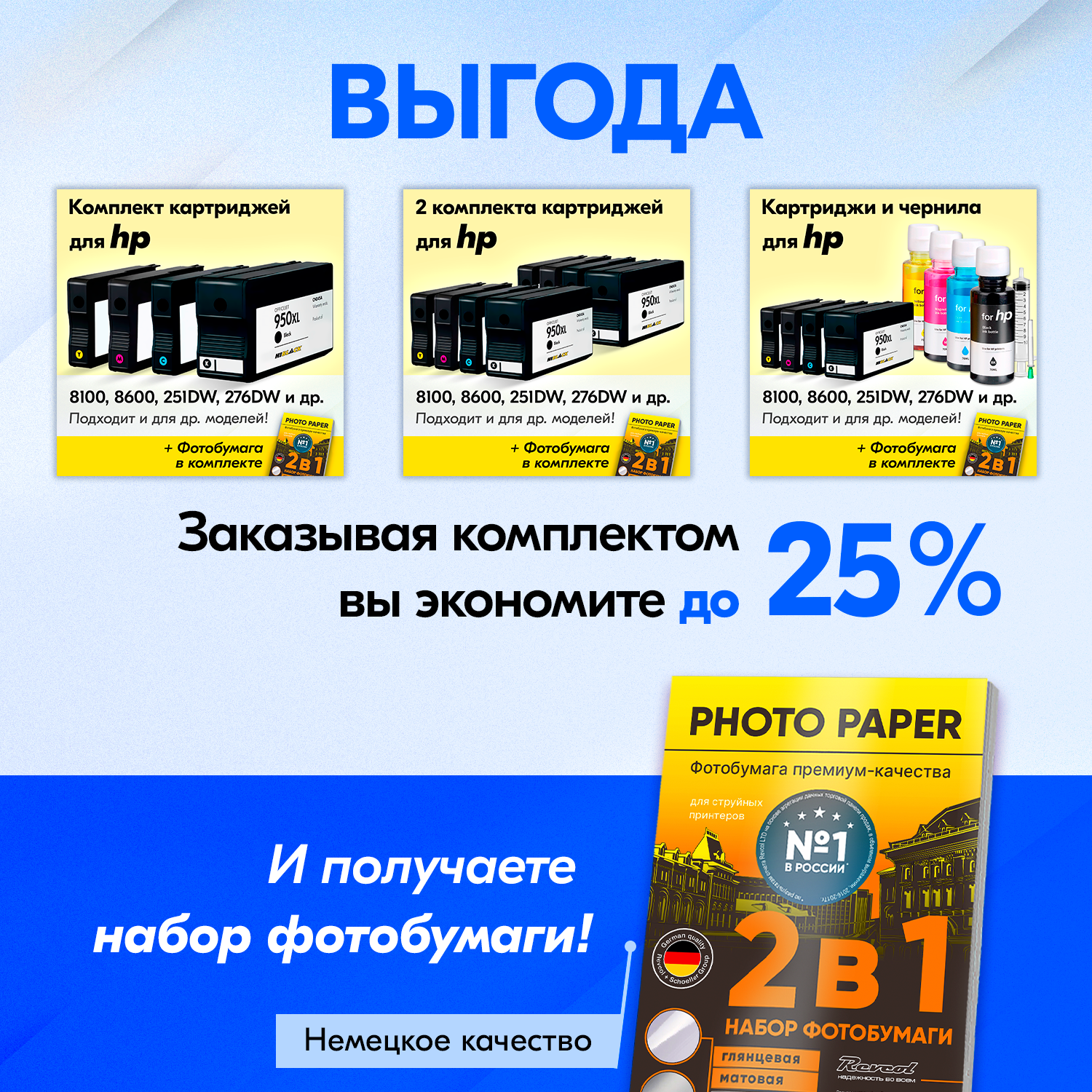 Картриджи для HP 950XL, 951XL, HP Officejet Pro 8100, 8600, 251dw, 276dw, 8610, 8620, 8630 и др. с чернилами черный, голубой, пурпурный, желтый новые заправляемые, 4 шт. 8 868 ₽
