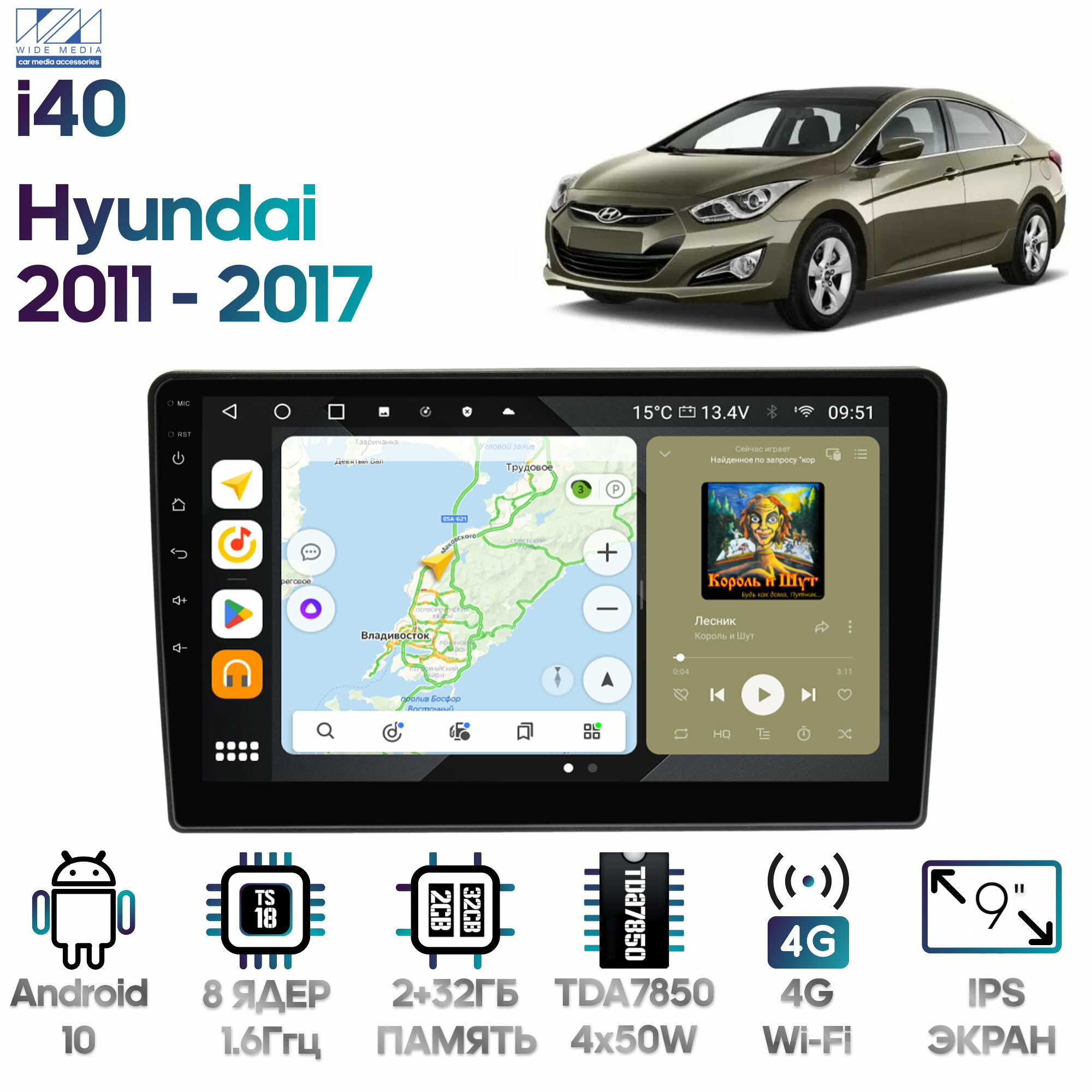 Штатная магнитола Wide Media Hyundai i40 2011 - 2017 [Android 10, 9 дюймов, 2/32GB, 8 ядер, DSP, 4G] информация: