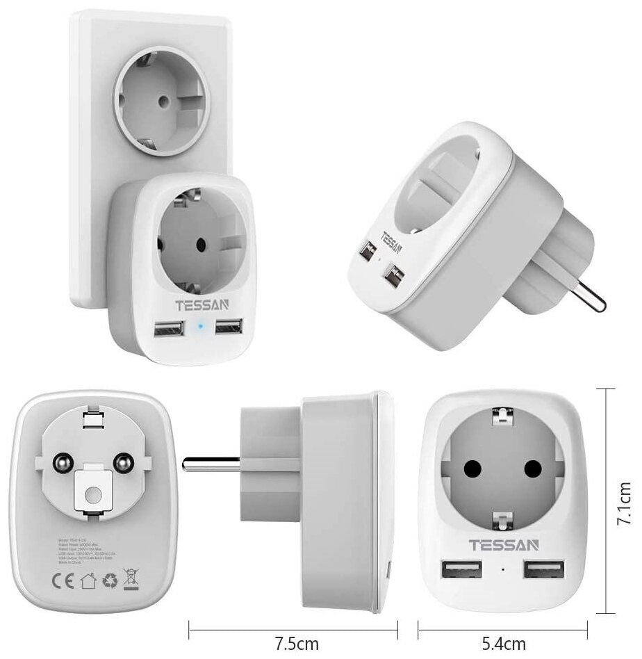 Розетка-адаптер с 1 разъемом 220В и 2 USB портами Tessan Ts-611-de Grey .
