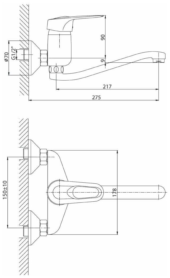 Смеситель на раковину настенный Эверест B46-350 с круглым поворотным изливом, кран-буксы 1/2", хром