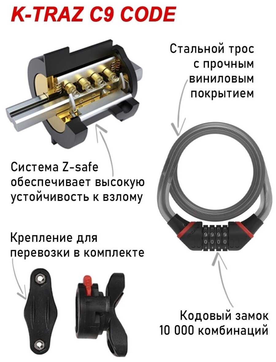 замок велосипедный 'k-traz c9 code', кодовый, 15мм х 1,85м информация: