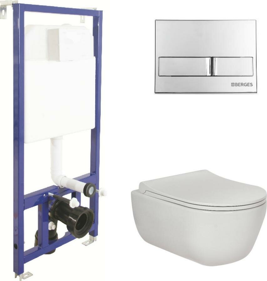 Комплект унитаза с инсталляцией Berges Wasserhaus Ego XL Rimless 043203 с сиденьем Микролифт и клавишей смыва Хром