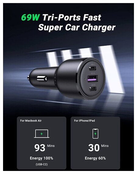 Отзывы на Зарядное устройство UGREEN CD239 (20467) для авто 2xUSB-C PD+USB-A/69W/черн