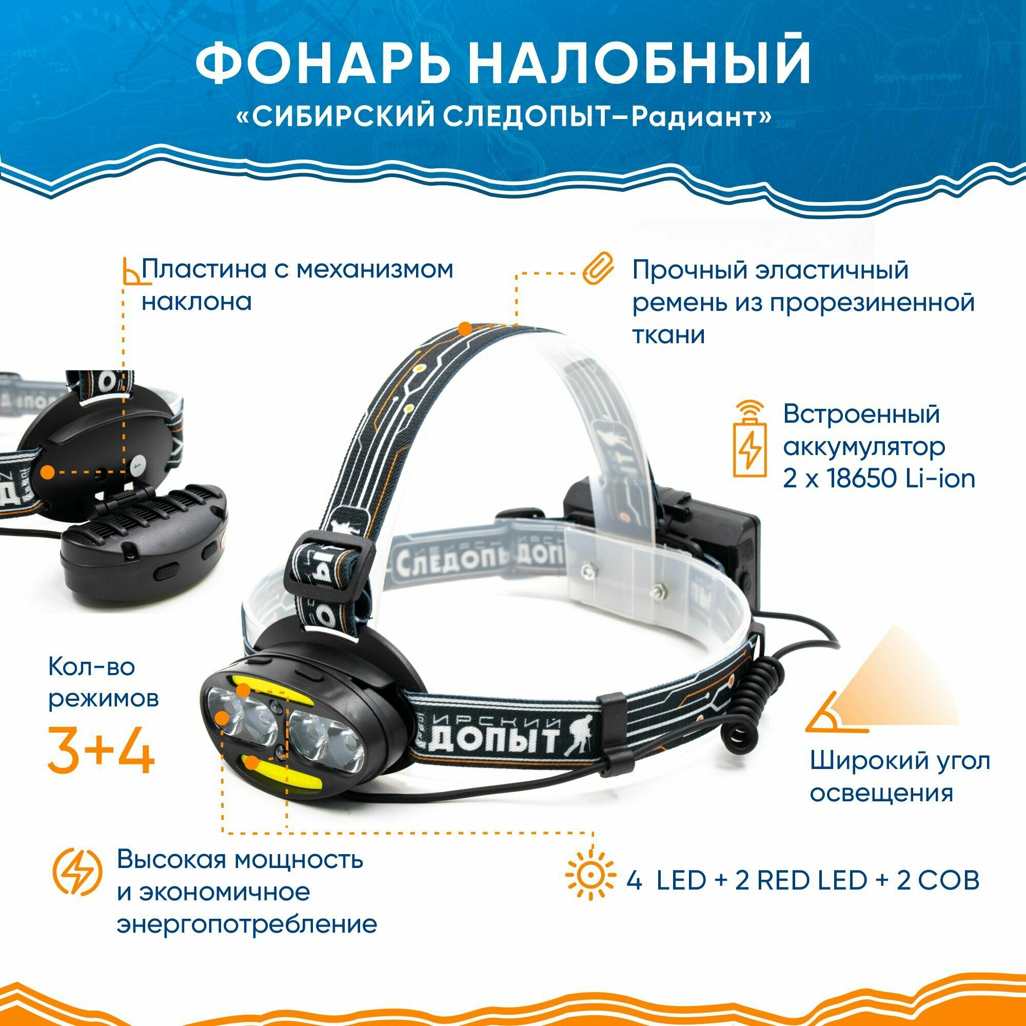 Фонарь налобный "сибирский следопыт-радиант", 4 LED + 2 COB, аккум. 220В информация: