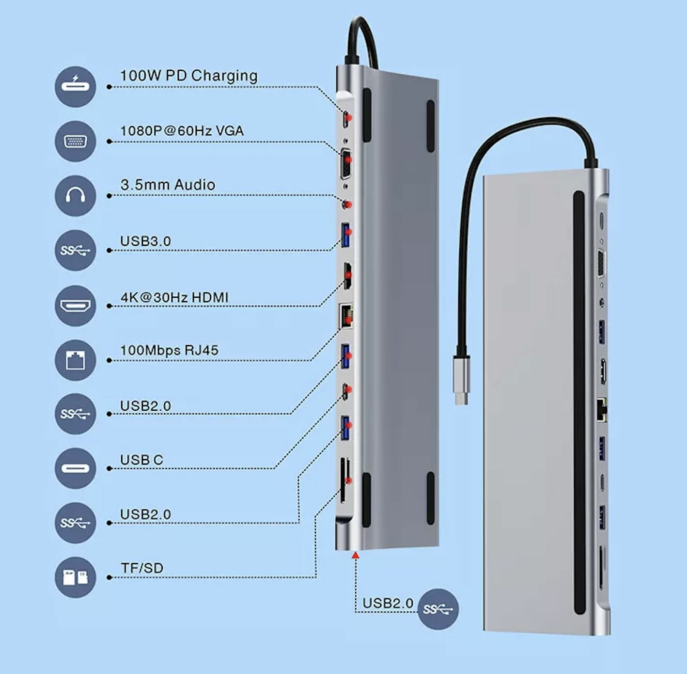 Док станция/usb хаб 12 в 1 Type C, HDMI, RJ 45, USB 3.0/2.0, audio 3.5, TF/SD/micro SD card, PD charging, grey информация: