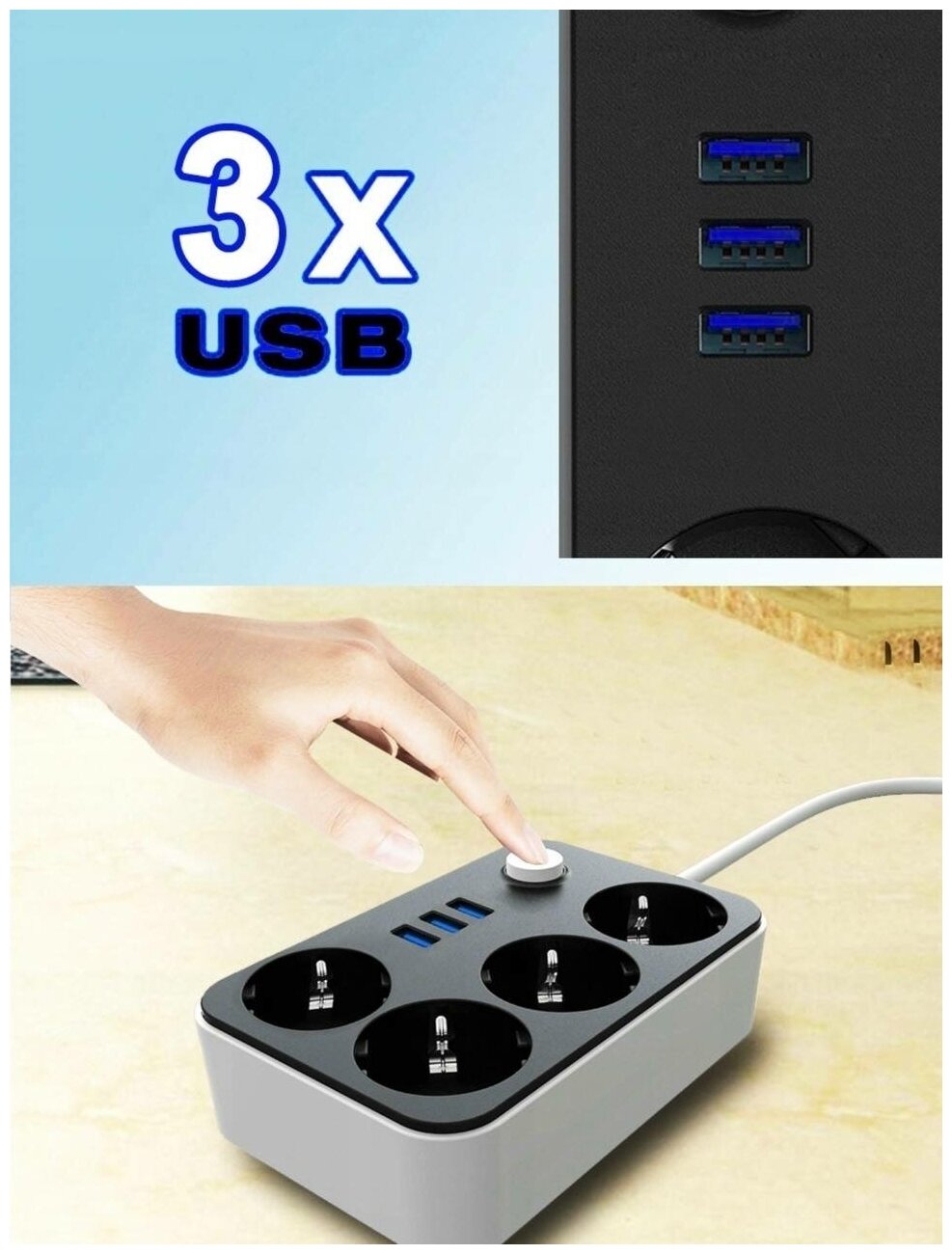 10 цен на Надежный сетевой фильтр 4 розетки 3 USB портов с защитой, Удлинитель 2 м, Удлинитель с USB, Разветвитель USB с умной зарядкой