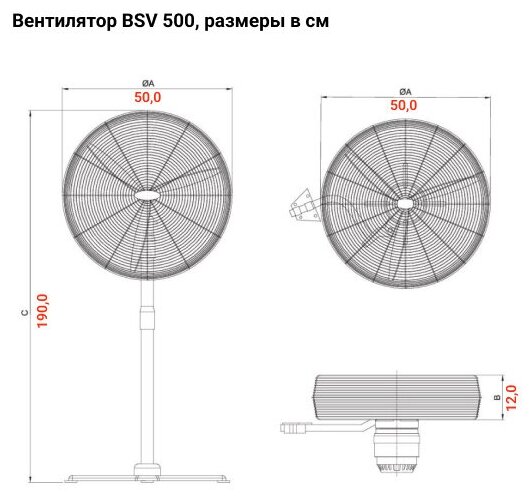Вентилятор напольный BVN BSV 500, промышленного типа, с защитной решеткой, 3 режима скорости, 7000 м3/час, 120 Вт информация: