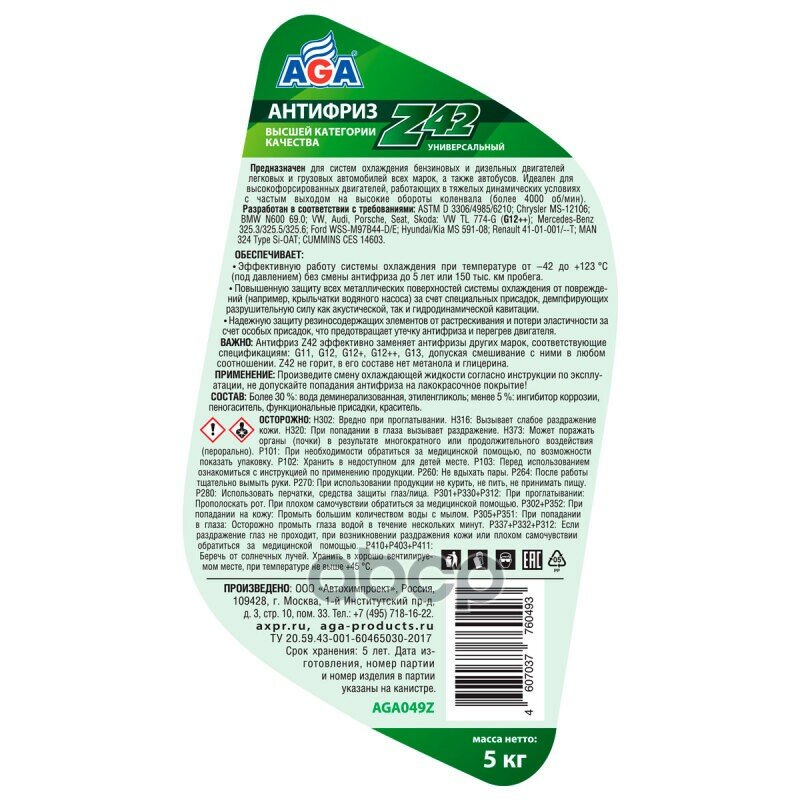 Антифриз AGA зеленый 5л AGA049Z информация: