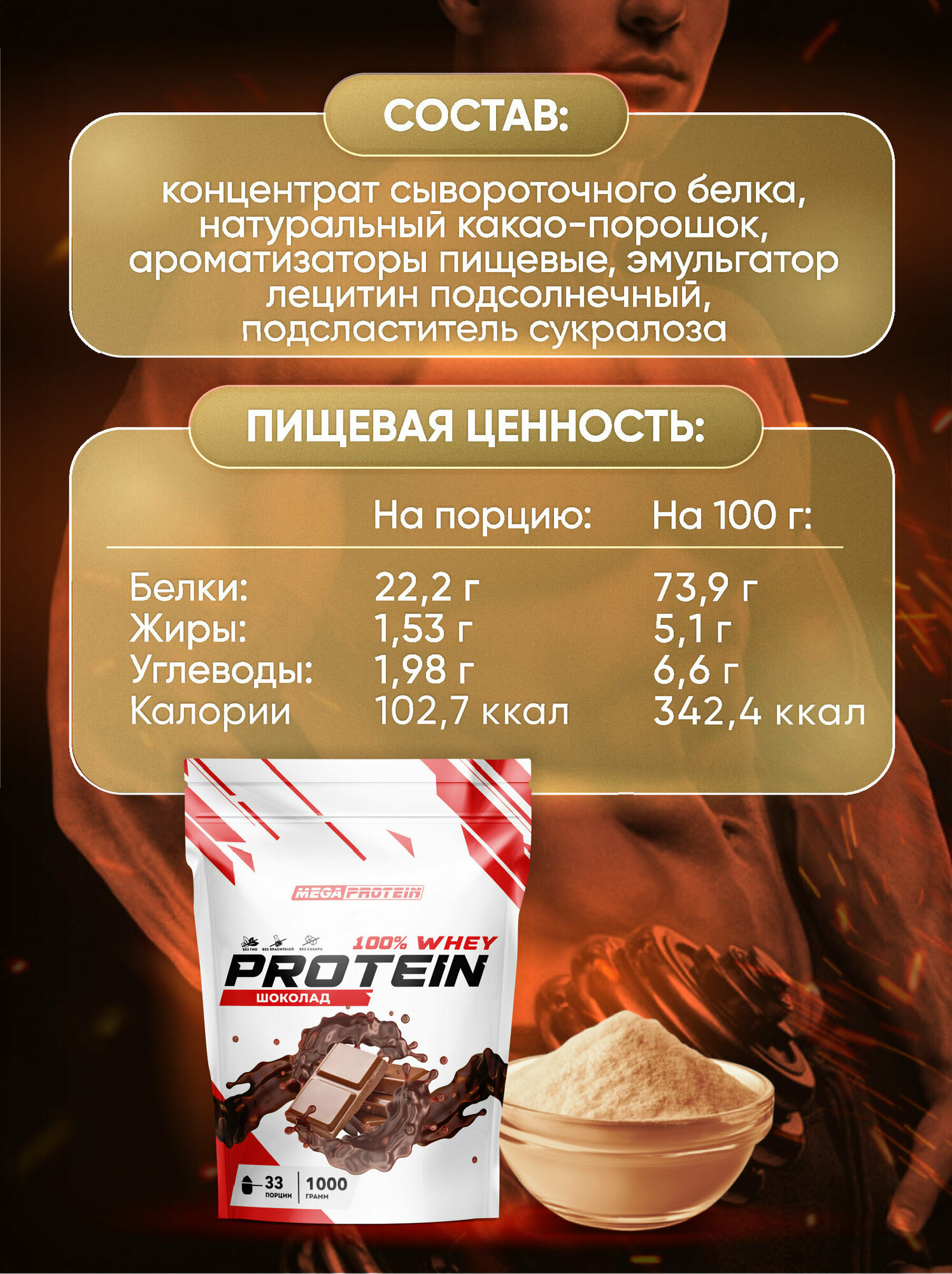 Сывороточный протеин / Протеиновый коктейль для набора мышечной массы и похудения со вкусом "Шоколад" информация: