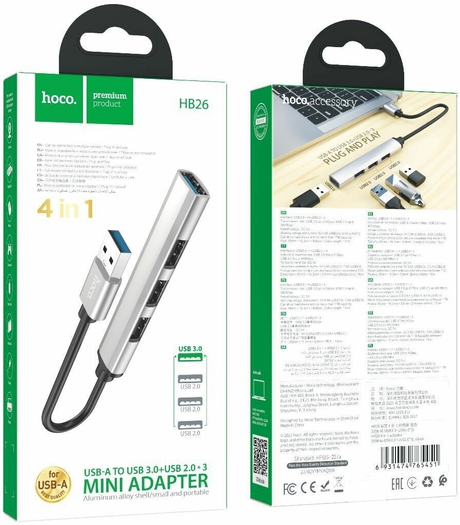 HUB адаптер Hoco HB26 USB 4в1, USB to USB3.0 + USB2.0*3, металлический корпус,13 см кабель, Серебристый информация: