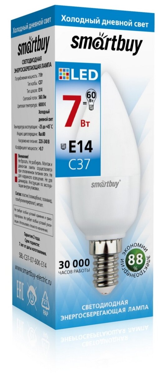 Отзывы на Лампа cветодиодная Smartbuy, Е14, C37, 7 Вт, 6000 К, холодный белый свет
