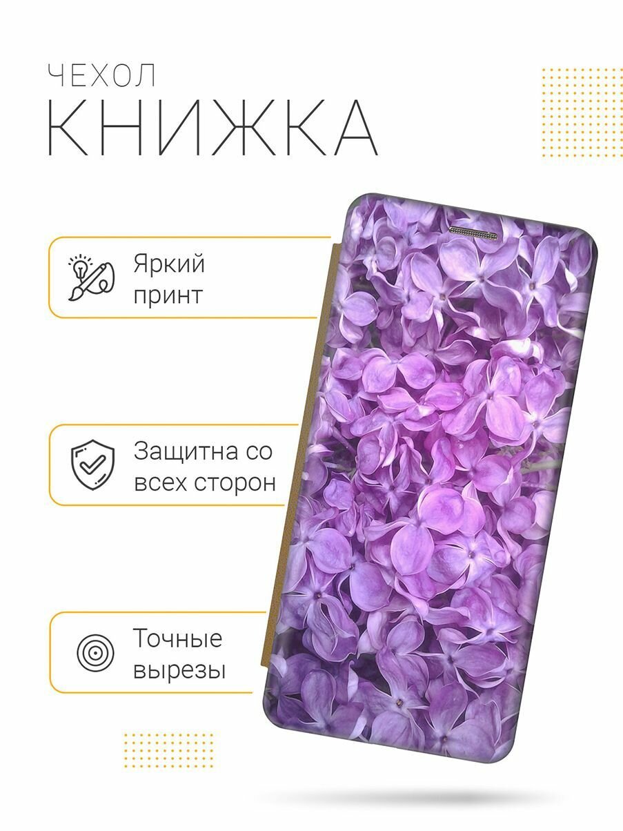 Чехол-книжка на Samsung Galaxy J2 Core, Самсунг Джей 2 Кор c принтом "Цветы в сиреневом" золотистый 807 ₽