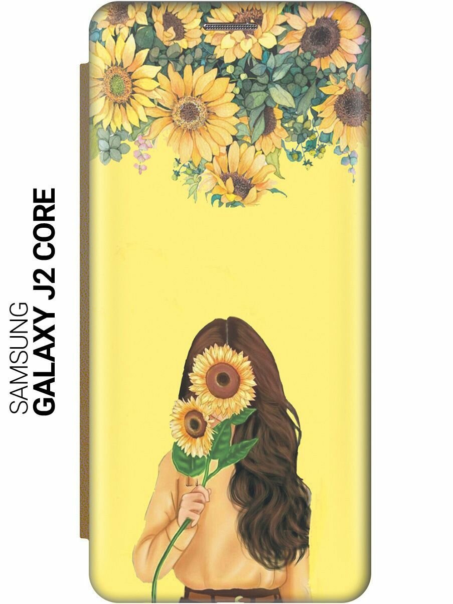 Чехол-книжка на Samsung Galaxy J2 Core / Самсунг Джей 2 Кор c принтом "Девушка и подсолнухи" золотистый информация: