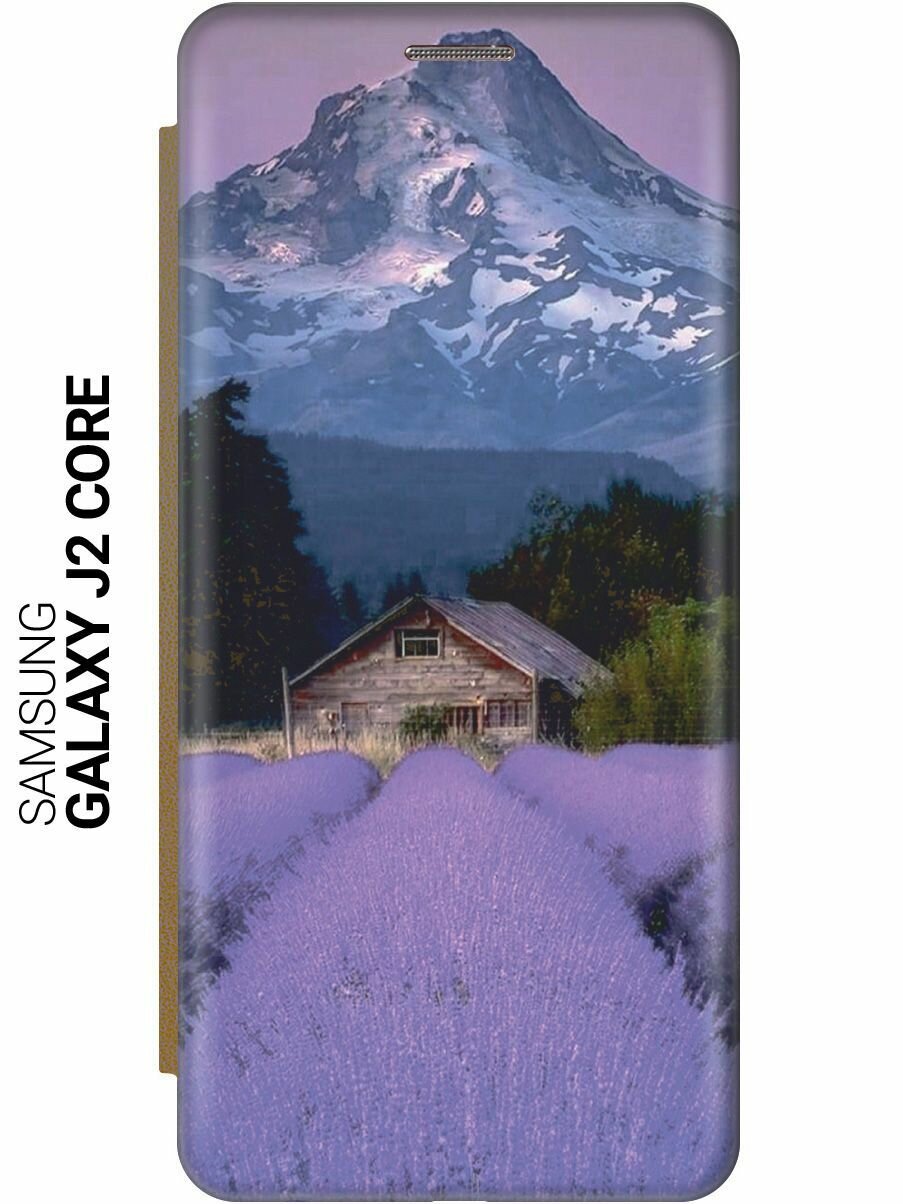 Чехол-книжка на Samsung Galaxy J2 Core / Самсунг Джей 2 Кор c принтом "Лавандовое поле в горах" золотистый информация: