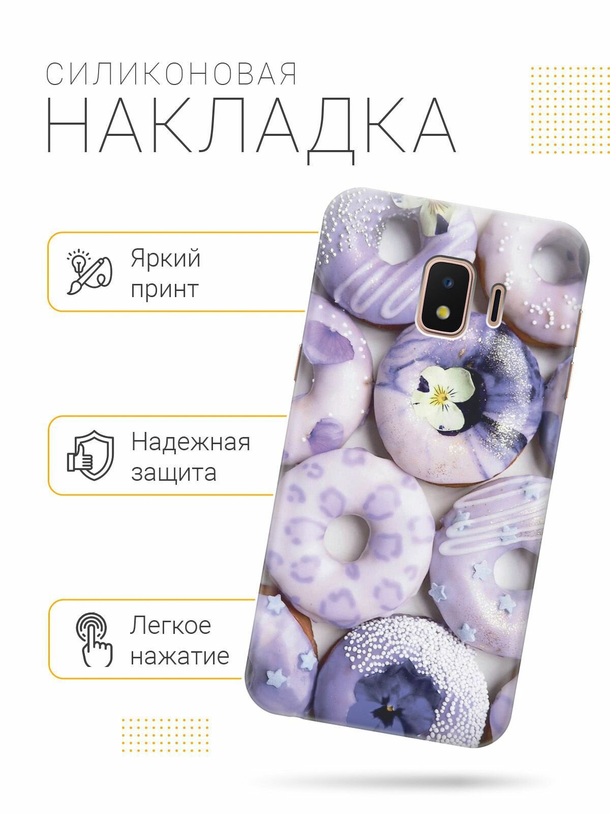 Отзывы на Силиконовый чехол на Samsung Galaxy J2 Core / Самсунг Джей 2 Кор с эффектом блеска "Лавандовые пончики"