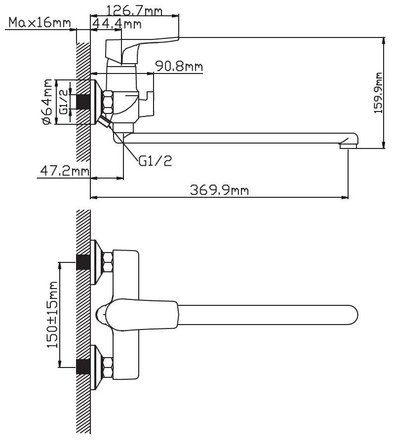 Смеситель на раковину настенный Эверест B46-350 с круглым поворотным изливом, кран-буксы 1/2", хром