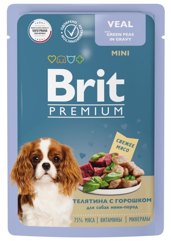 Влажный корм для собак. Пауч для взрослых собак мини пород, Телятина с зеленым горошком, в соусе, 85г, 14 шт BRIT PREMIUM