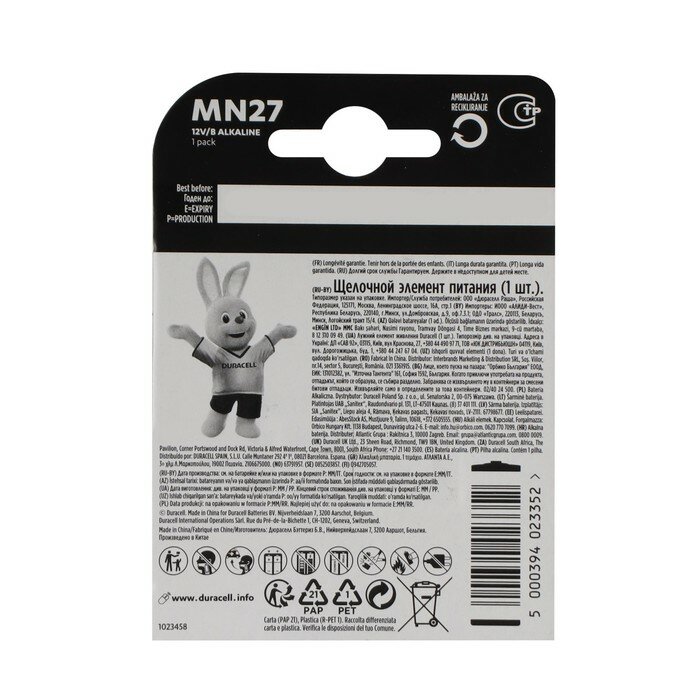 Батарейка алкалиновая Duracell Basic, MN27 (A27, V27A)-1BL, 12В, блистер, 1 шт. информация:
