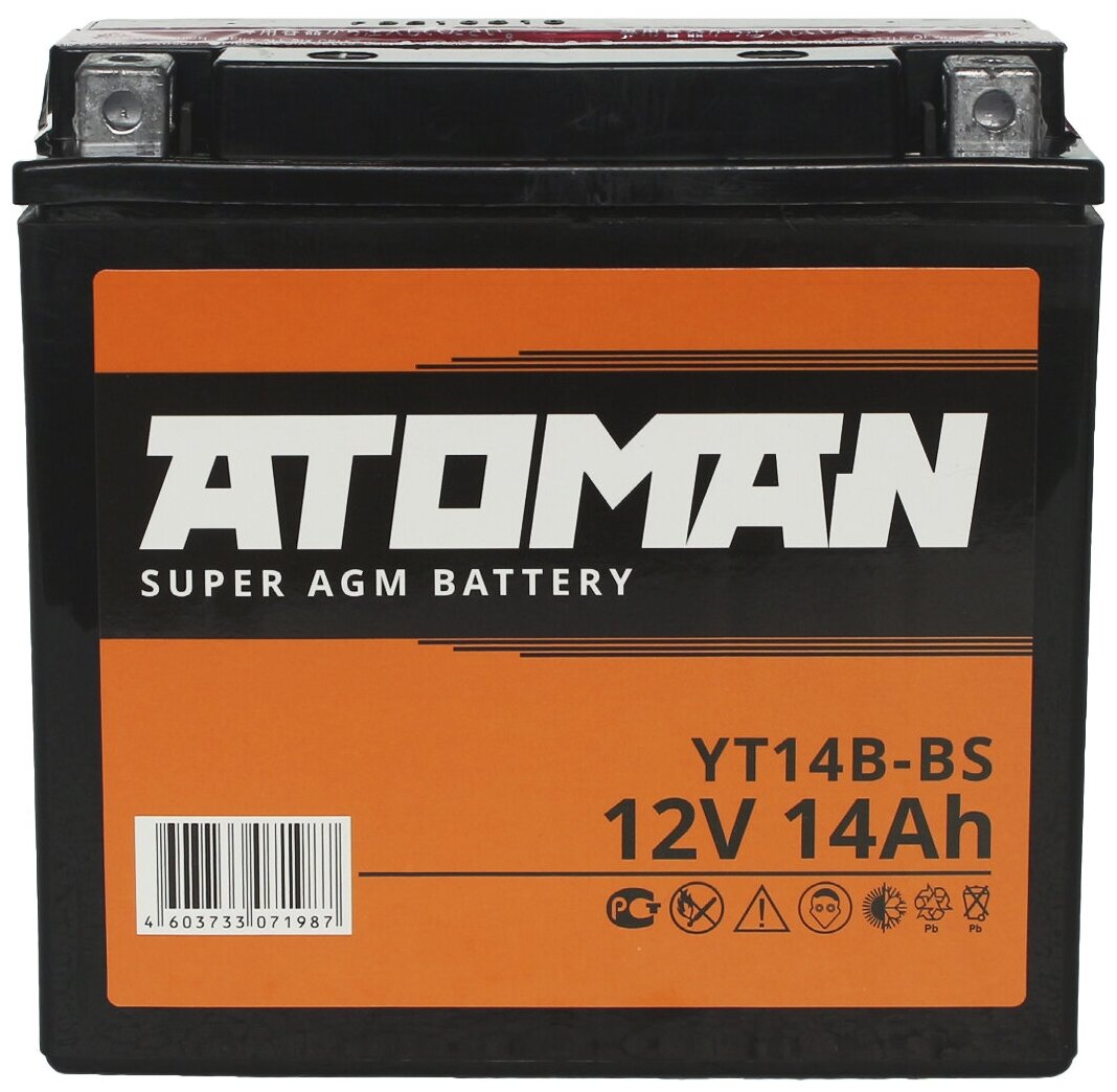 Аккумулятор Мото ATOMAN Super AGM 12V 14Ah (YT14B-BS) сухозар., п/п 140А электролит в комплекте информация: