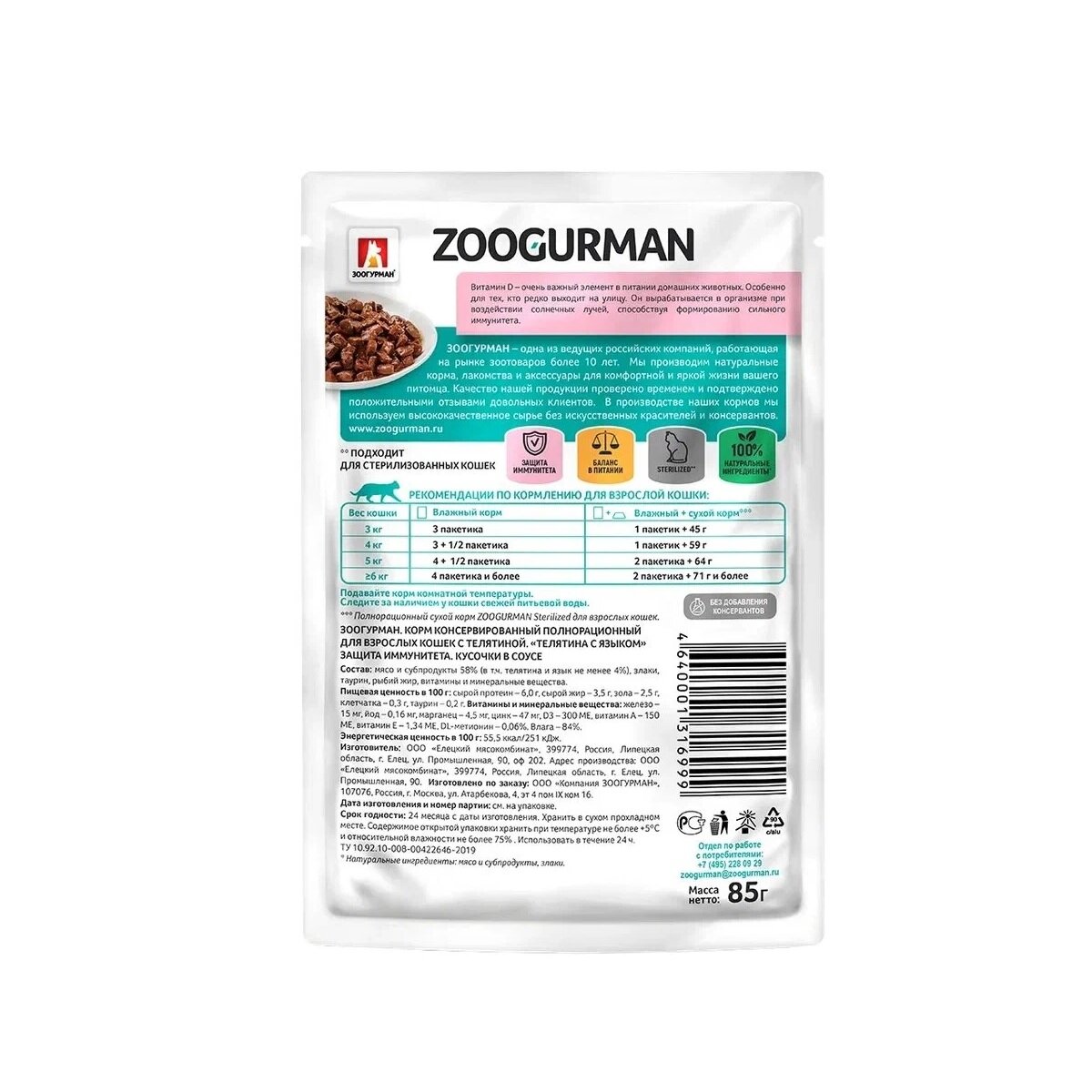 ZOOGURMAN для взрослых кошек с телятиной и языком в соусе (85 гр х 30 шт) информация: