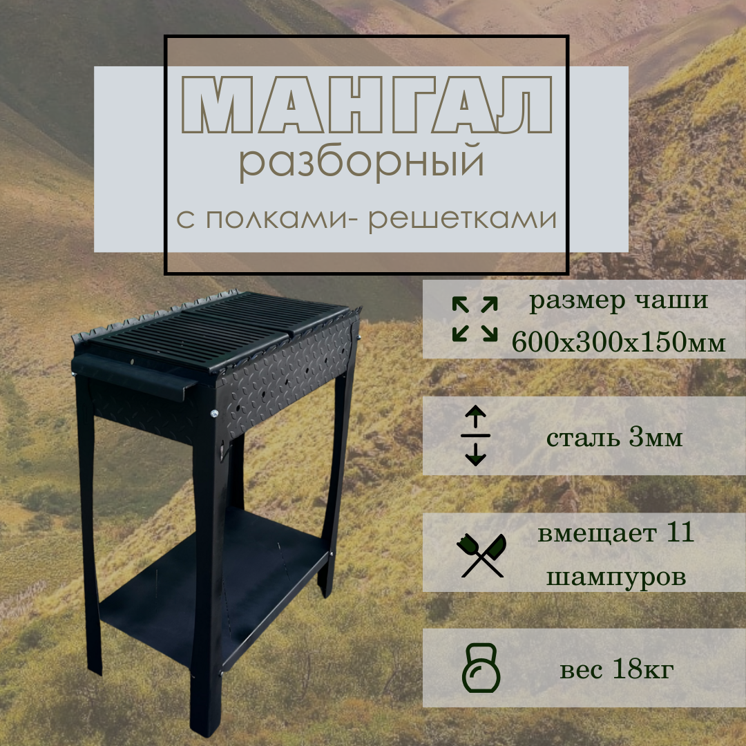 Мангал 800 мм. с полкой-решёткой и полкой под казан, сталь рифленая-усиленная 3 мм. разборный, с полкой под дрова