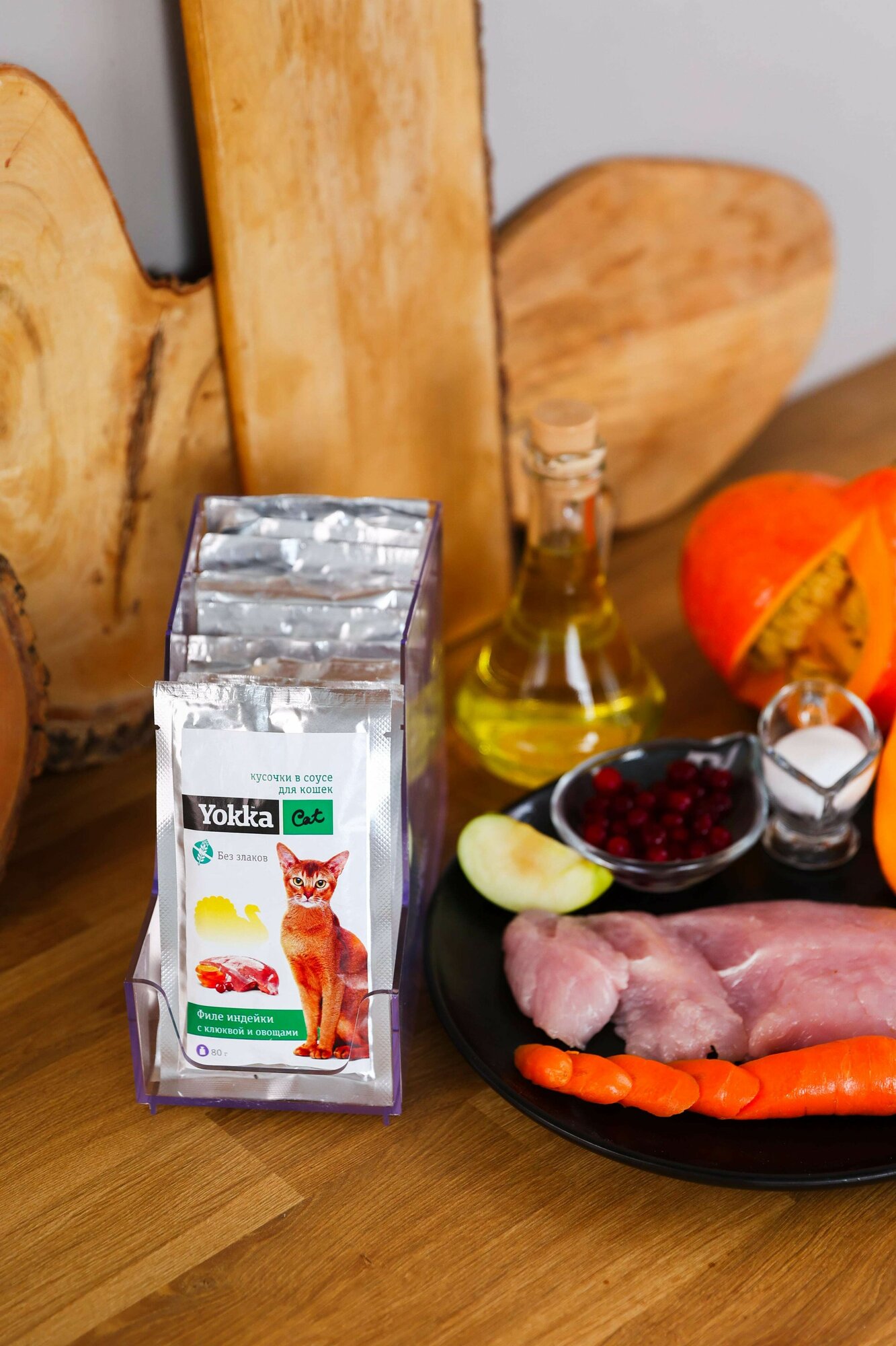 Отзывы на Yokka Cat Натуральный беззерновой консервированный корм для кошек из индейки с овощами и клюквой, кусочки в соусе, 80г (12 шт/уп)
