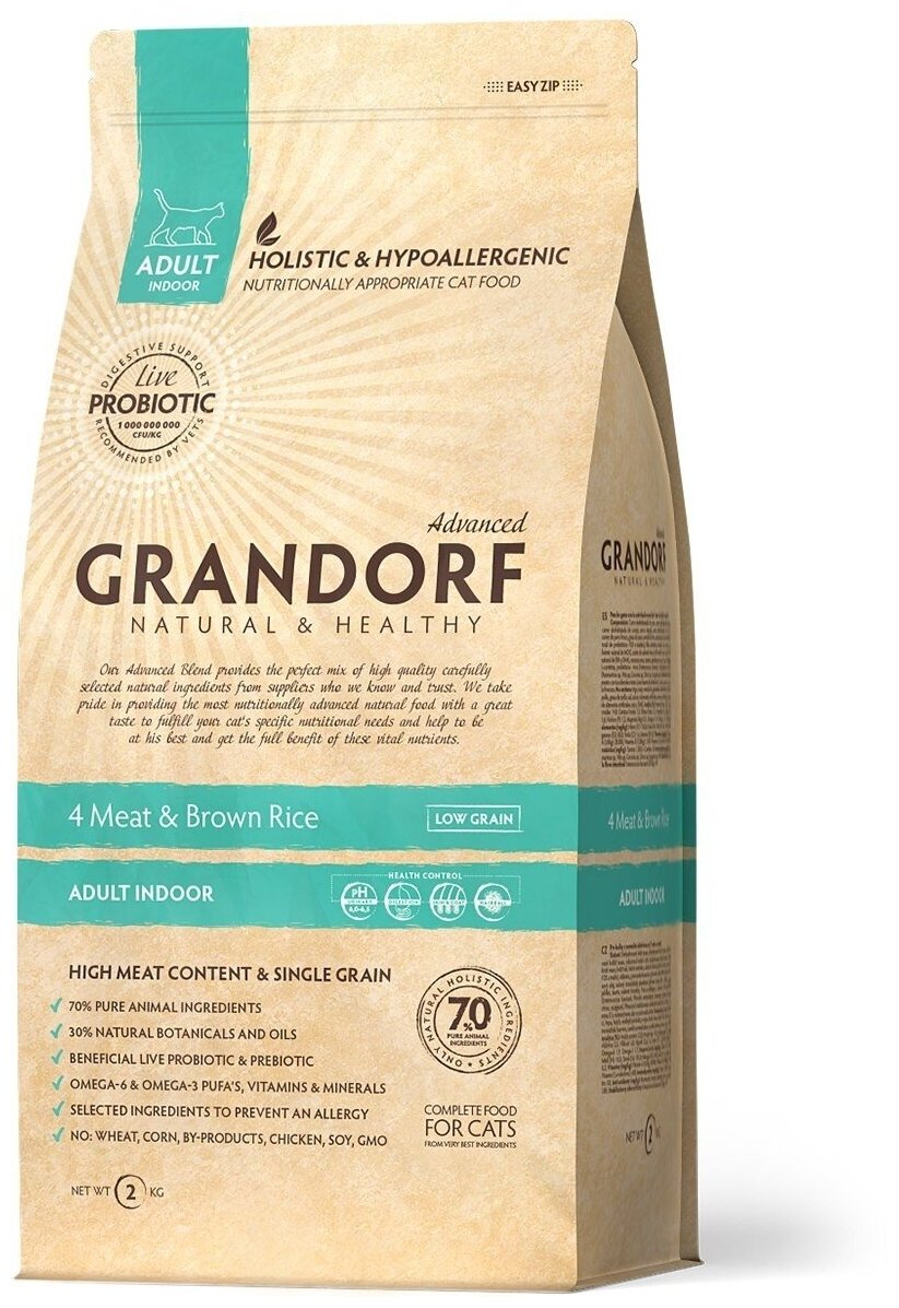 Корм для домашних кошек - 2 кг. Grandorf 4Meat & Brown Rice Adult Indoor информация: