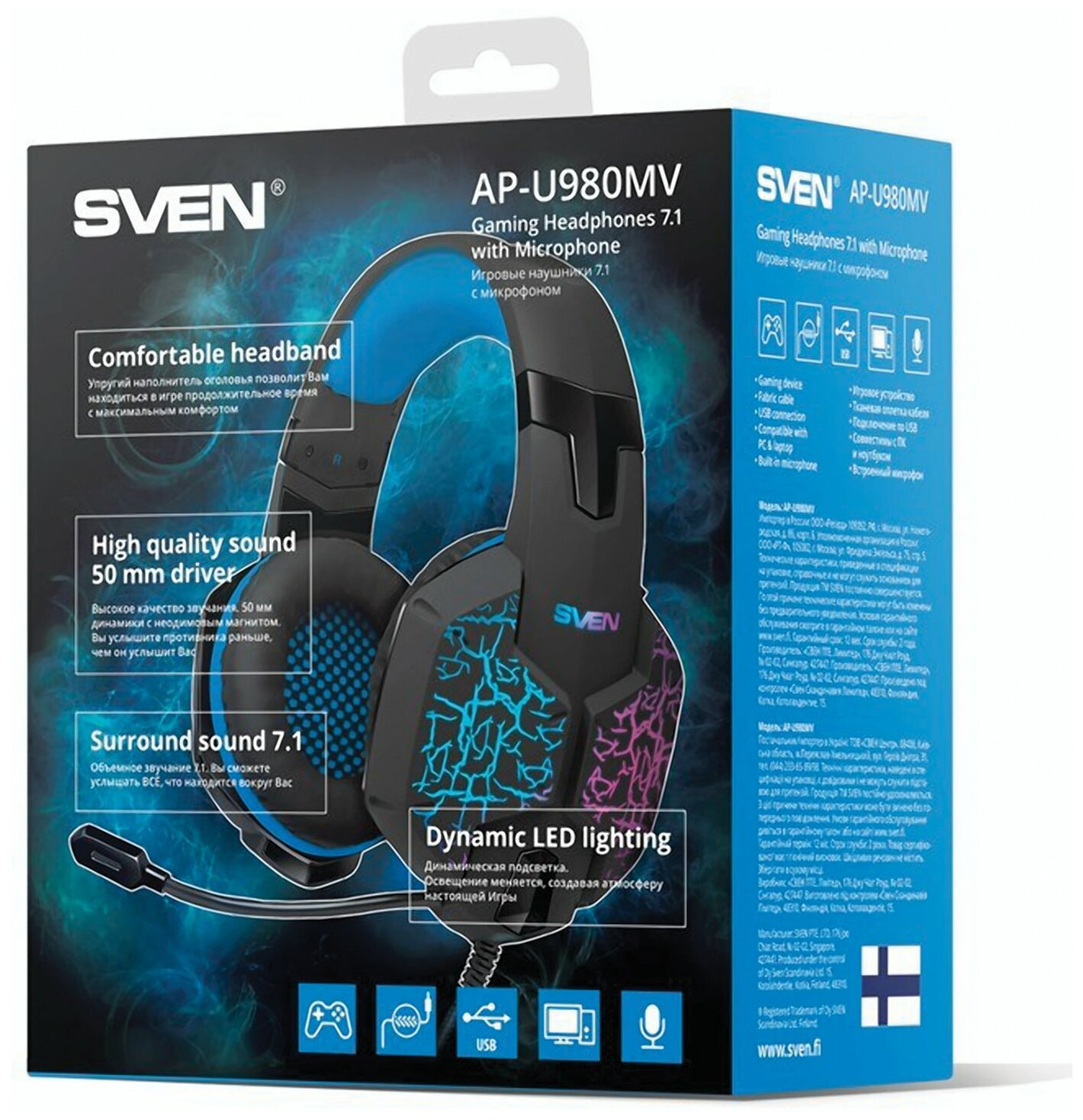 Игровые стереонаушники с микрофоном SVEN AP-U980MV, черный-синий (USB, LED, 7.1)