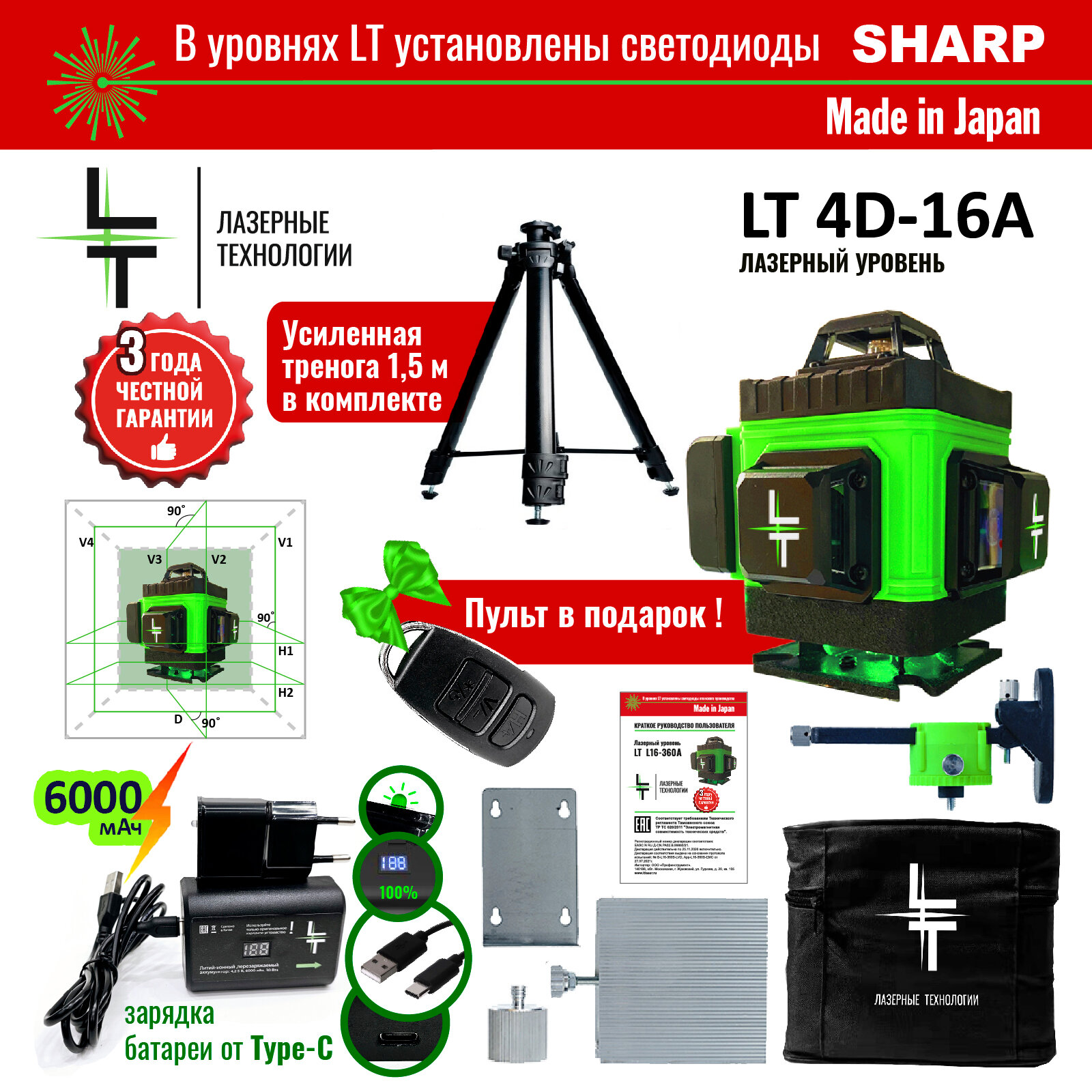 Профессиональный Лазерный уровень (нивелир ) LT В 16 линий 4D С японскими светодиодами SHARP + Штанга штатив с треногой 3.6 метра